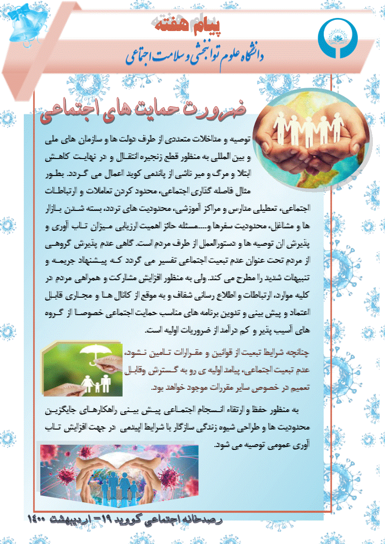 ضرورت طراحی شیوه زندگی سازگار با شرایط همه گیری و حفظ و ارتقای انسجام اجتماعی و تدوین برنامه های مناسب حمایت اجتماعی خصوصا از گروه های آسیب پذیر و کم درآمد