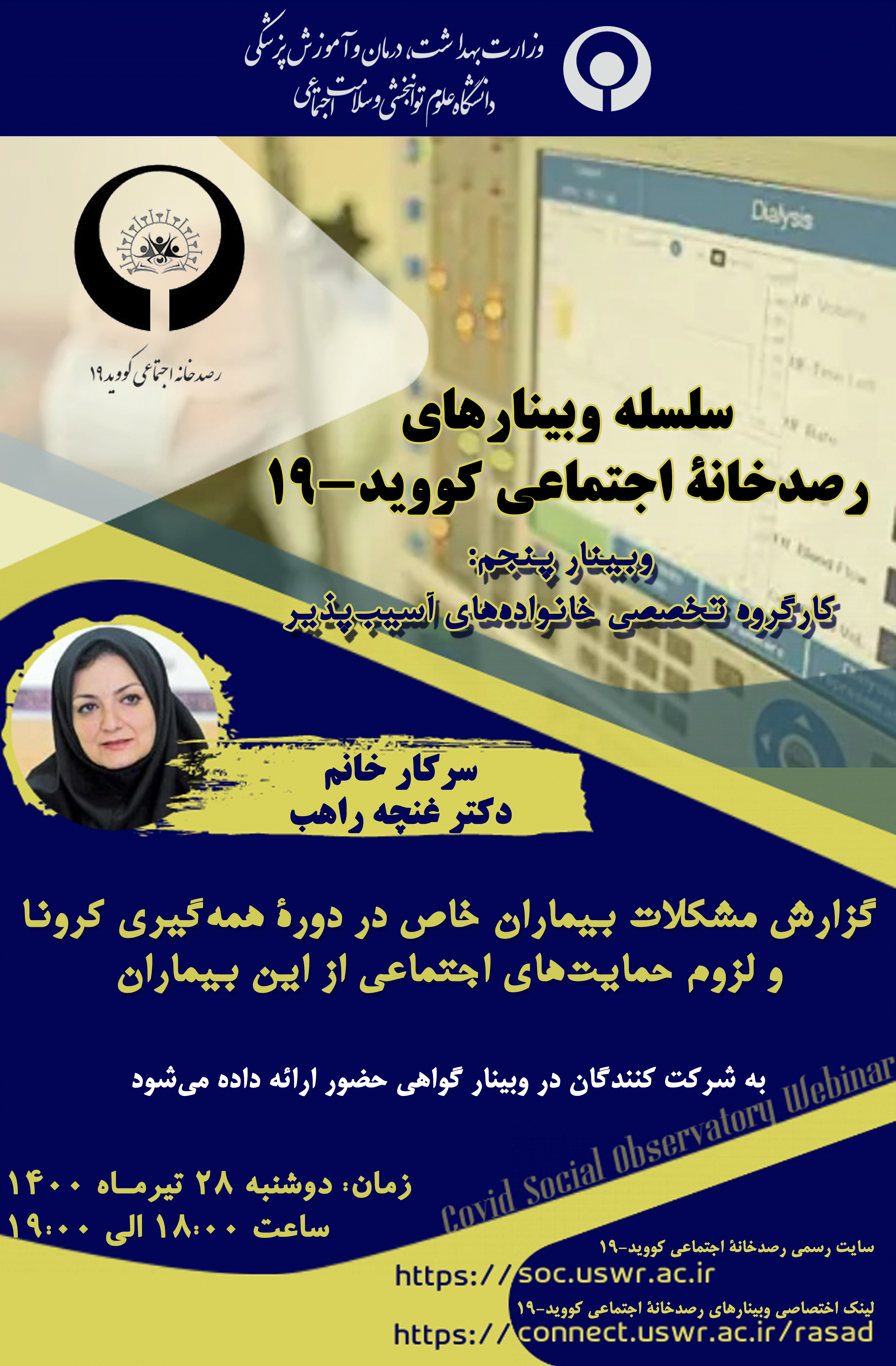 پنجمین وبینار رصدخانه اجتماعی کووید19 به گزارش مشکلات بیماری های خاص در دوره همه گیری کرونا و لزوم حمایت های اجتماعی از این بیماران می پردازد.