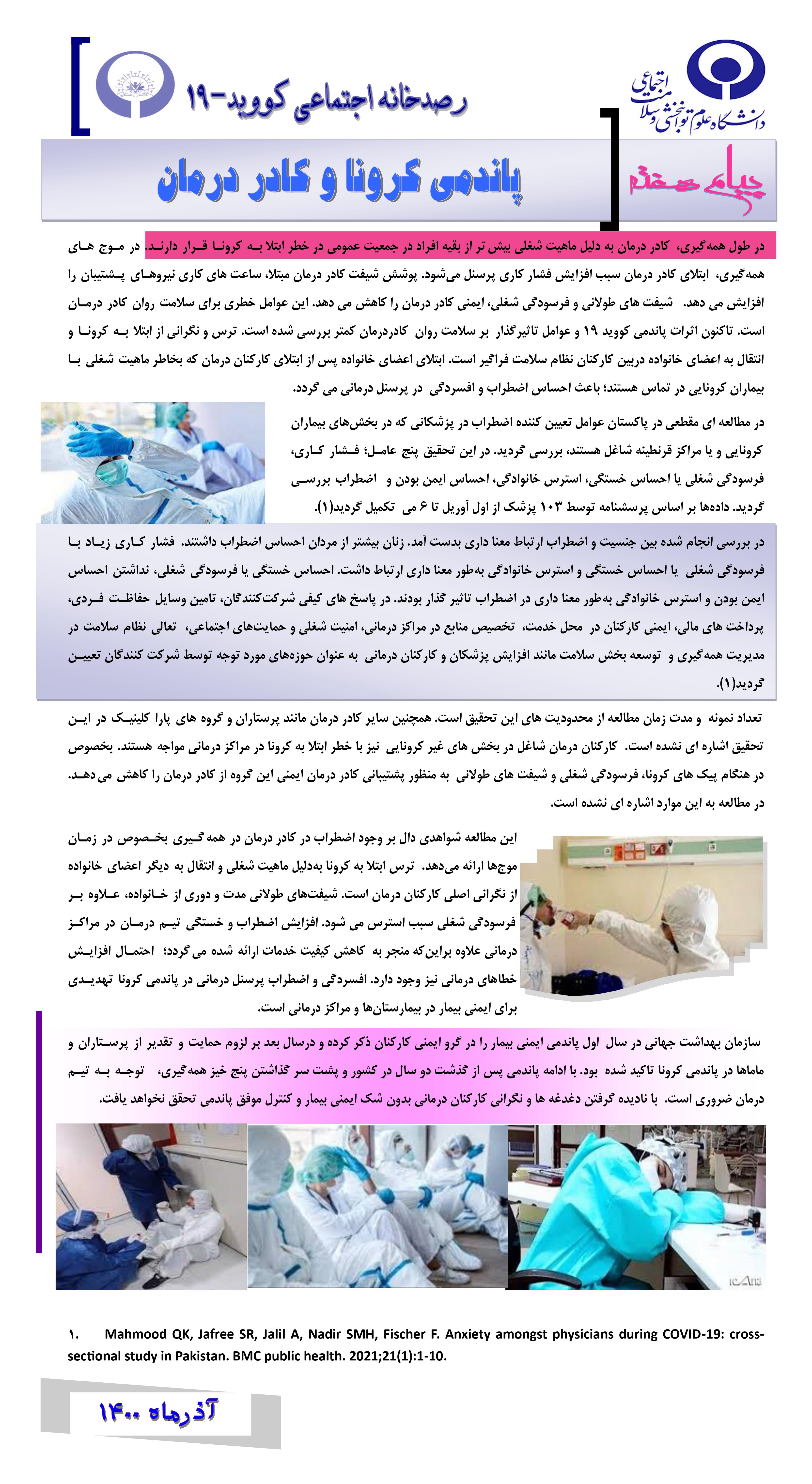 در طول دوران همه گیری، کادر درمان به دلیل ماهیت شغلی شان بیشتر از بقیه افراد در جمعیت عمومی در خطر ابتلا به کرونا قرار داشته اند. سازمان جهانی بهداشت بر لزوم حمایت و تقدیر از کادر درمانی در پاندمی کرونا تاکید داشته است. با ادامه پاندمی و پس از گذشت 2 سال و پشت سرگذاشتن 5 خیز همه گیری در ایران توجه به تیم درمان ضروری است.