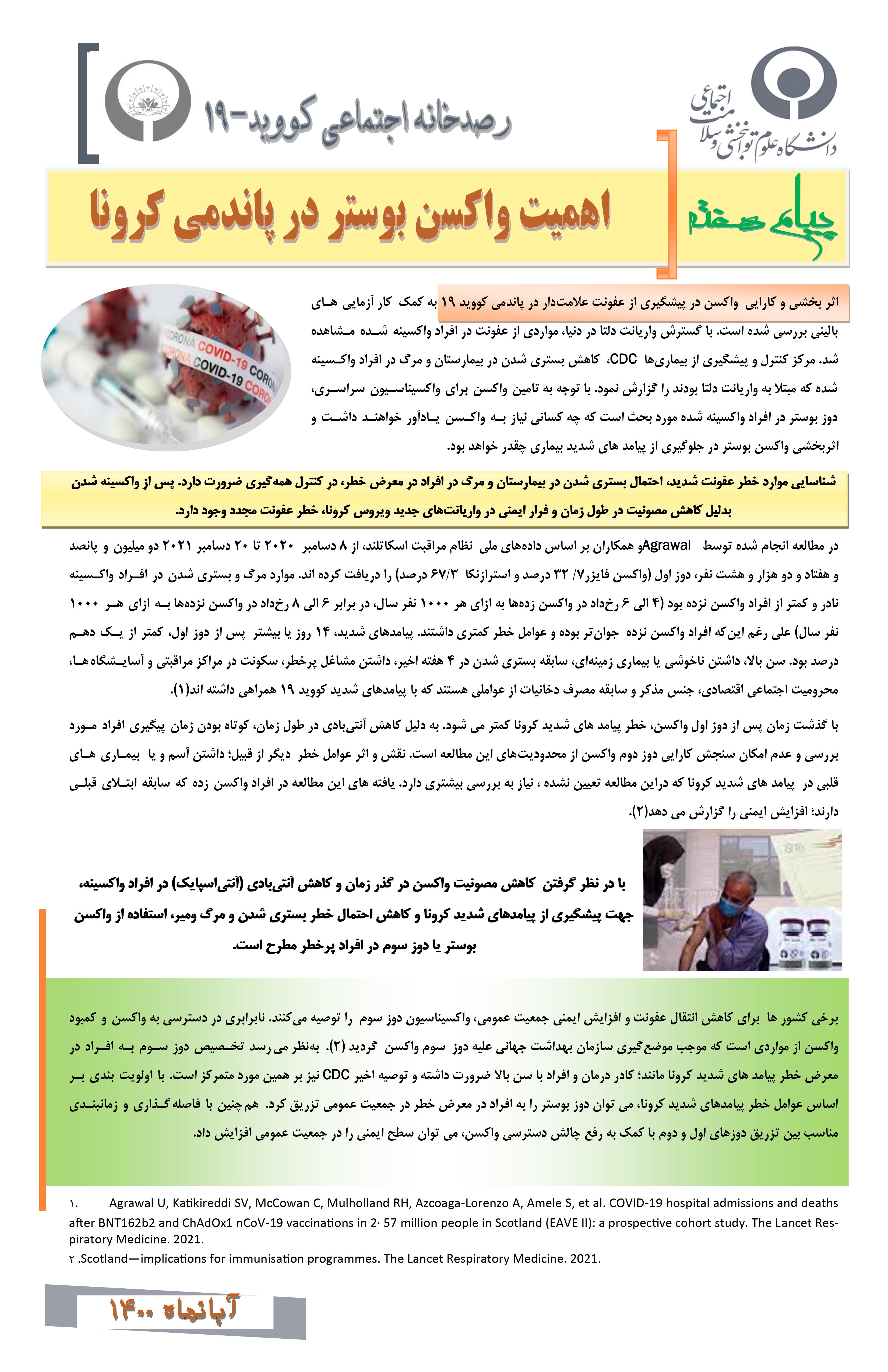 با توجه به کاهش مصونیت واکسن طی زمان و کاهش آنتی بادی (آنتی اسپایک) در افراد واکسینه، جهت پیشگیری از پیامدهای شدید کرونا و کاهش احتمال خطر بستری شدن و مرگ و میر، استفاده از واکسن بوستر یا دوز سوم در افراد پرخطر توصیه می شود.